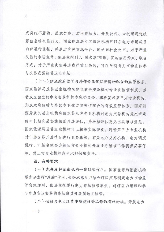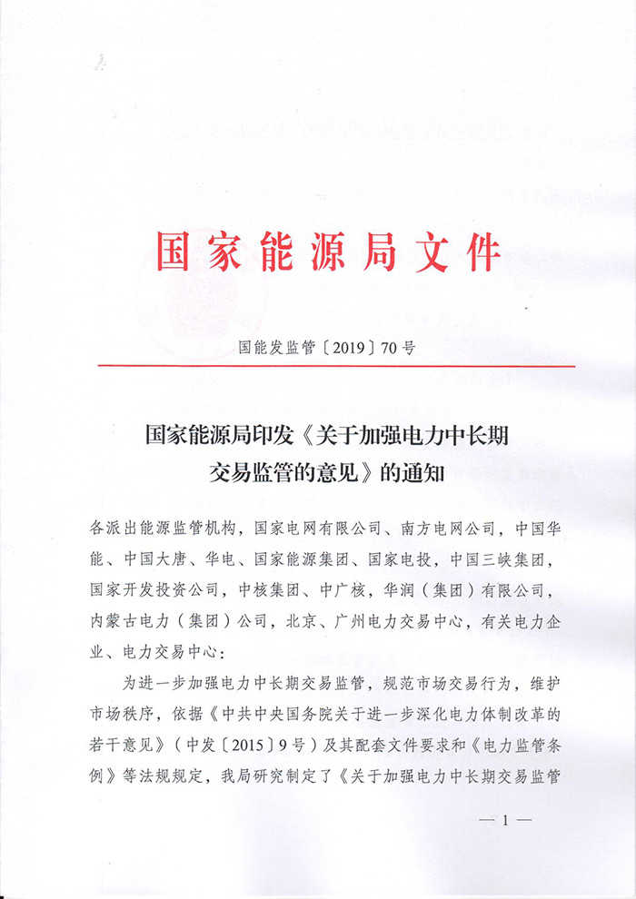 國家能源局印發(fā)《關(guān)于加強電力中長期交易監(jiān)管的意見》的通知(國能發(fā)監(jiān)管〔2019〕70號)